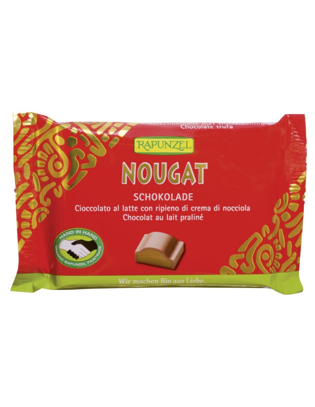 czekolada* (50%) (cukier trzcinowy*, mleko w proszku* (27%), tłuszcz kakaowy*, masa kakaowa*, lecytyna sojowa*, wanilia Bourbon*), nadzienie* (50%) (cukier trzcinowy Cristallino*, pasta z orzechów laskowych* (36%), tłuszcz kakaowy*, mleko w proszku*, masa kakaowa*, lecytyna sojowa* (*certyfikowany składnik ekologiczny)