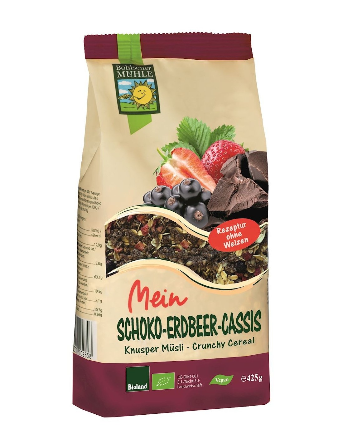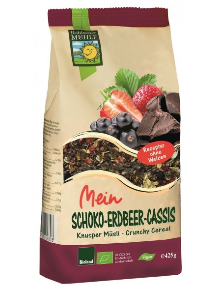 CRUNCHY CZEKOLADOWO - TRUSKAWKOWO - PORZECZKOWE BIO 425 g - BOHLSENER MUEHLE