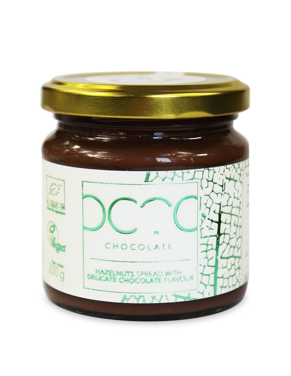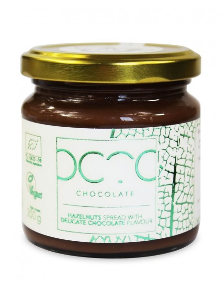 orzechy laskowe* 58%, cukier z kwiatu palmy kokosowej*, kakao w proszku* 4%, emulgator: lecytyna słonecznikowa* , wanilia Bourbon* (*certyfikowany składnik ekologiczny)