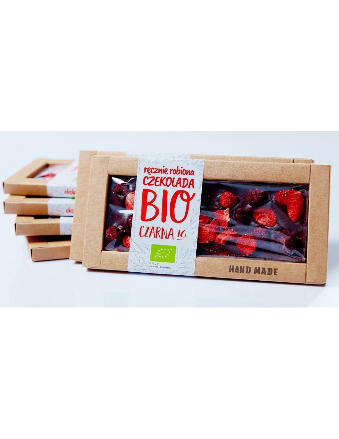 56,5%. Czekolada ręcznie robiona. Zawiera liofilizowane truskawki i jeżyny.