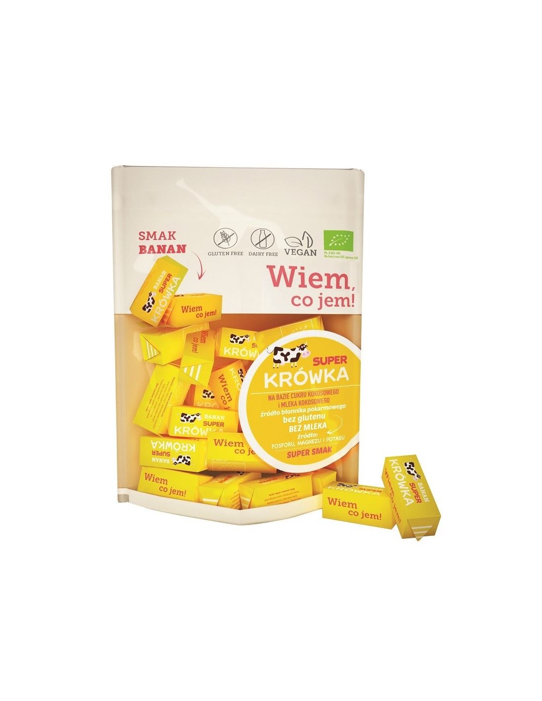 cukier kokosowy*, napój kokosowy w proszku*, syrop ryżowy*, białko słonecznika*, guma arabska (błonnik z akacji)*, banan suszony w proszku* (4%), aromat naturalny (*certyfikowany składnik ekologiczny)