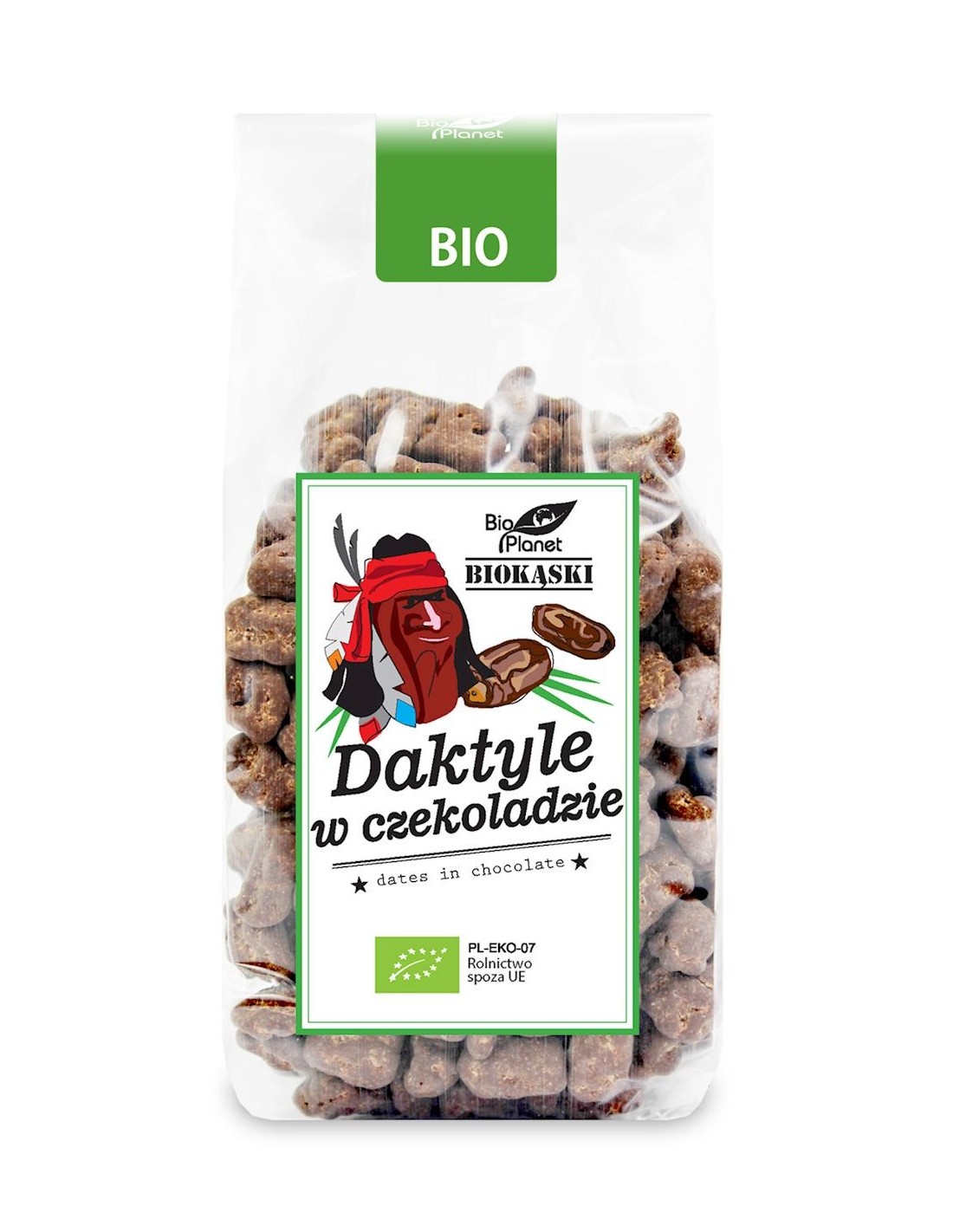 Ekologiczne suszone daktyle oblane czekoladą z nieprażonych ziaren kakaowca, słodzoną cukrem kokosowym. Stanowią wyśmienitą samodzielną przekąskę, również dla osób na diecie wegańskiej.