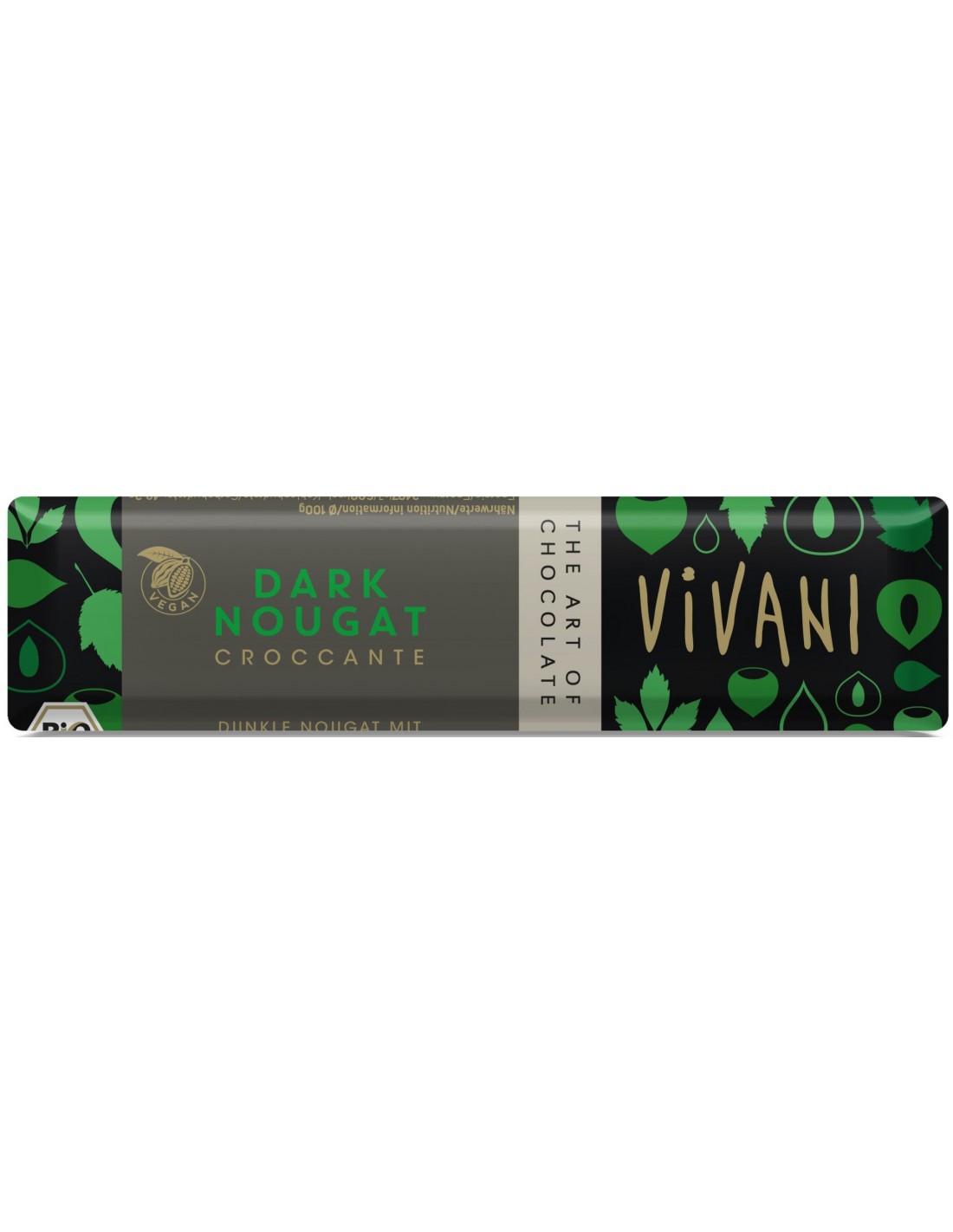 Ciemna czekolada nugatowa z chrupiącymi kawałkami orzecha laskowego.