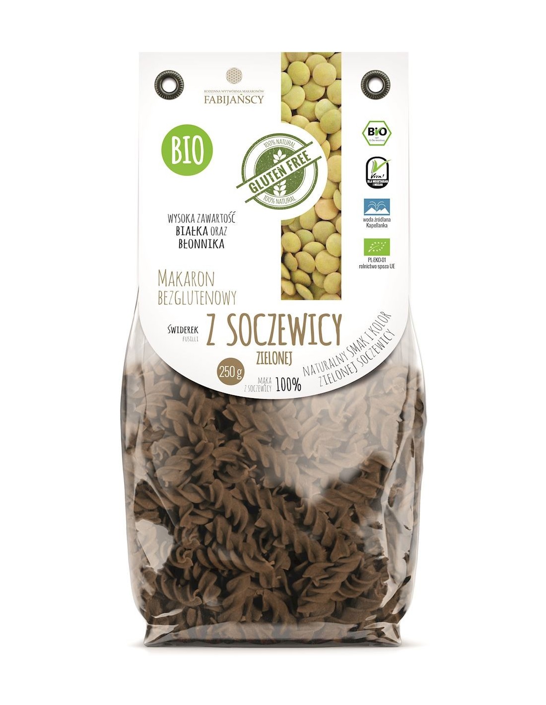 MAKARON (Z SOCZEWICY ZIELONEJ) ŚWIDERKI FUSILLI BEZGLUTENOWY BIO 250 g - FABIJAŃSCY