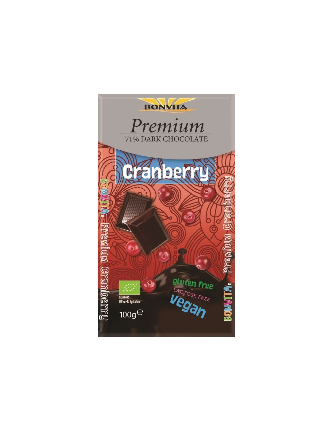 CZEKOLADA PREMIUM GORZKA 71% Z ŻURAWINĄ BEZ LAKTOZY BEZGLUTENOWA BIO 100 g - BONVITA