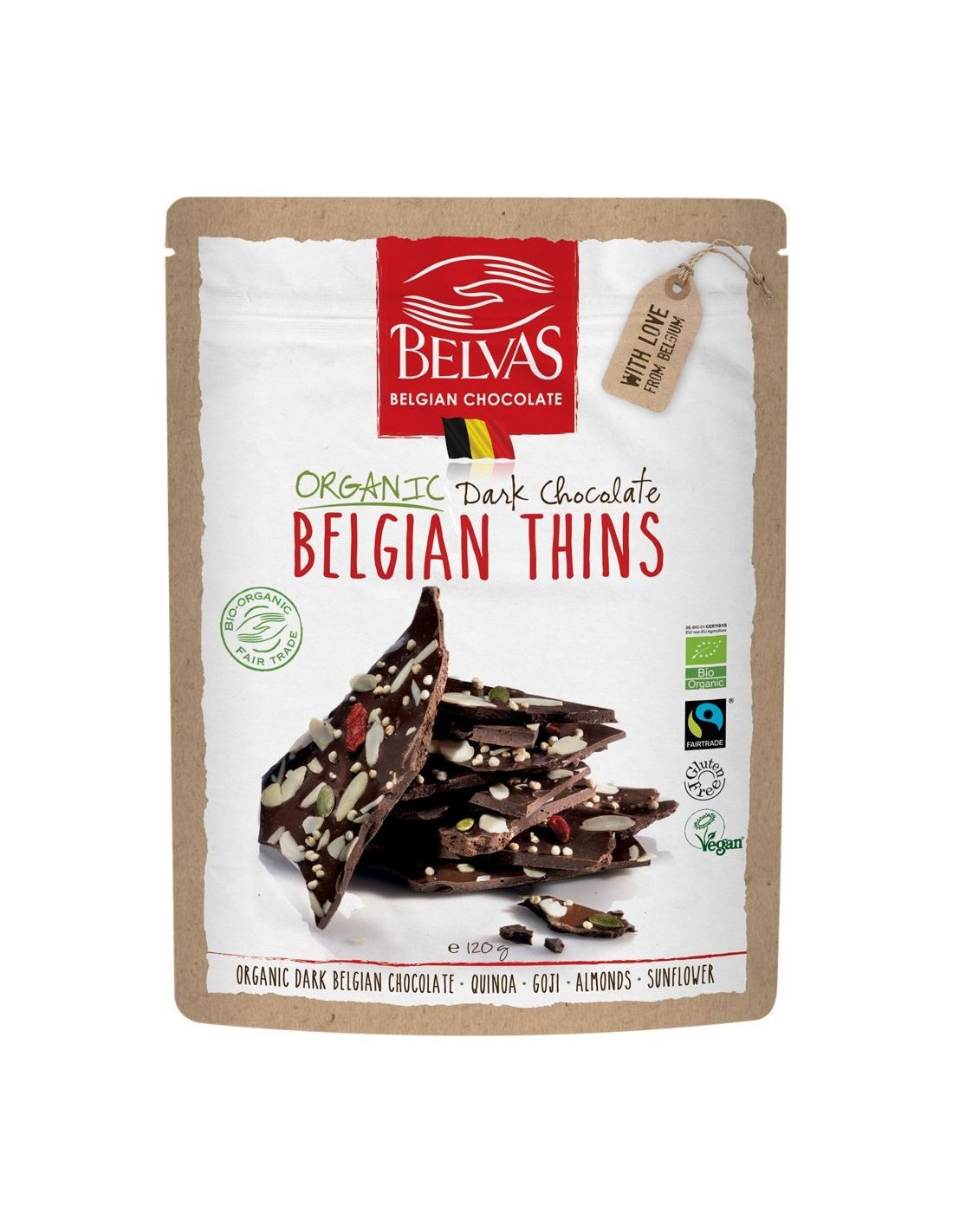 KAWAŁKI CZEKOLADY GORZKIEJ Z MIGDAŁAMI, QUINOA, JAGODAMI GOJI BIO 120 g - BELVAS