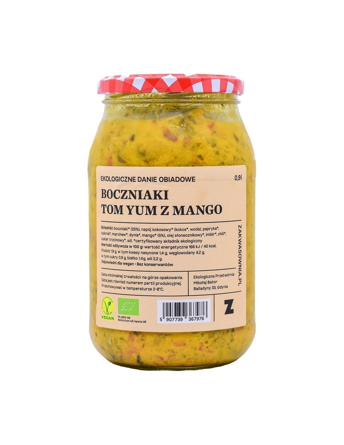 boczniaki*, fasolka szparagowa*, papryka*, cukinia*, marchew*, mango* 5%, dynia*, napój kokosowy*, olej*, woda (* certyfikowany składnik ekologiczny)