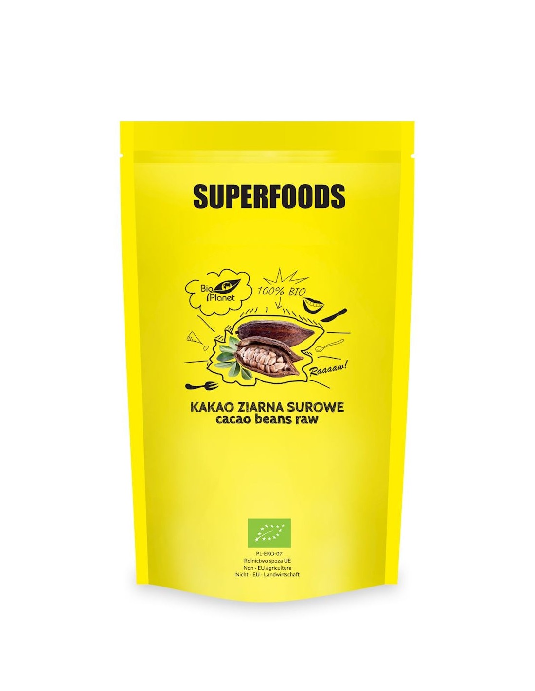 Ekologiczne surowe całe ziarna kakao, otrzymane z najwyższej jakości ziaren kakaowca. Charakteryzują się wytrawnym kakaowym smakiem. Przetwarzane w niskich temperaturach w celu zachowania maksymalnej ilości składników odżywczych. Stanowią podstawowy składnik czekolady. Mogą stanowić bazę dla wielu produktów czekoladowych lub dodatek do wszelkiego rodzaju przekąsek, lodów, koktajli, musli, ciast, deserów, jak również do kawy i gorącej czekolady.