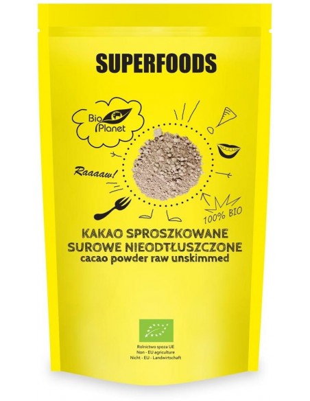 Ekologiczne sproszkowane kakao otrzymane z najwyższej jakości ziaren kakaowca. Ziarna kakao przed zmieleniem zostały głęboko zamrożone (mielenie kriogeniczne), co pozwoliło zachować maksymalną ilość składników odżywczych, a także naturalny smak i aromat produktu. Polecamy jako składnik deserów, wypieków oraz innych przekąsek.