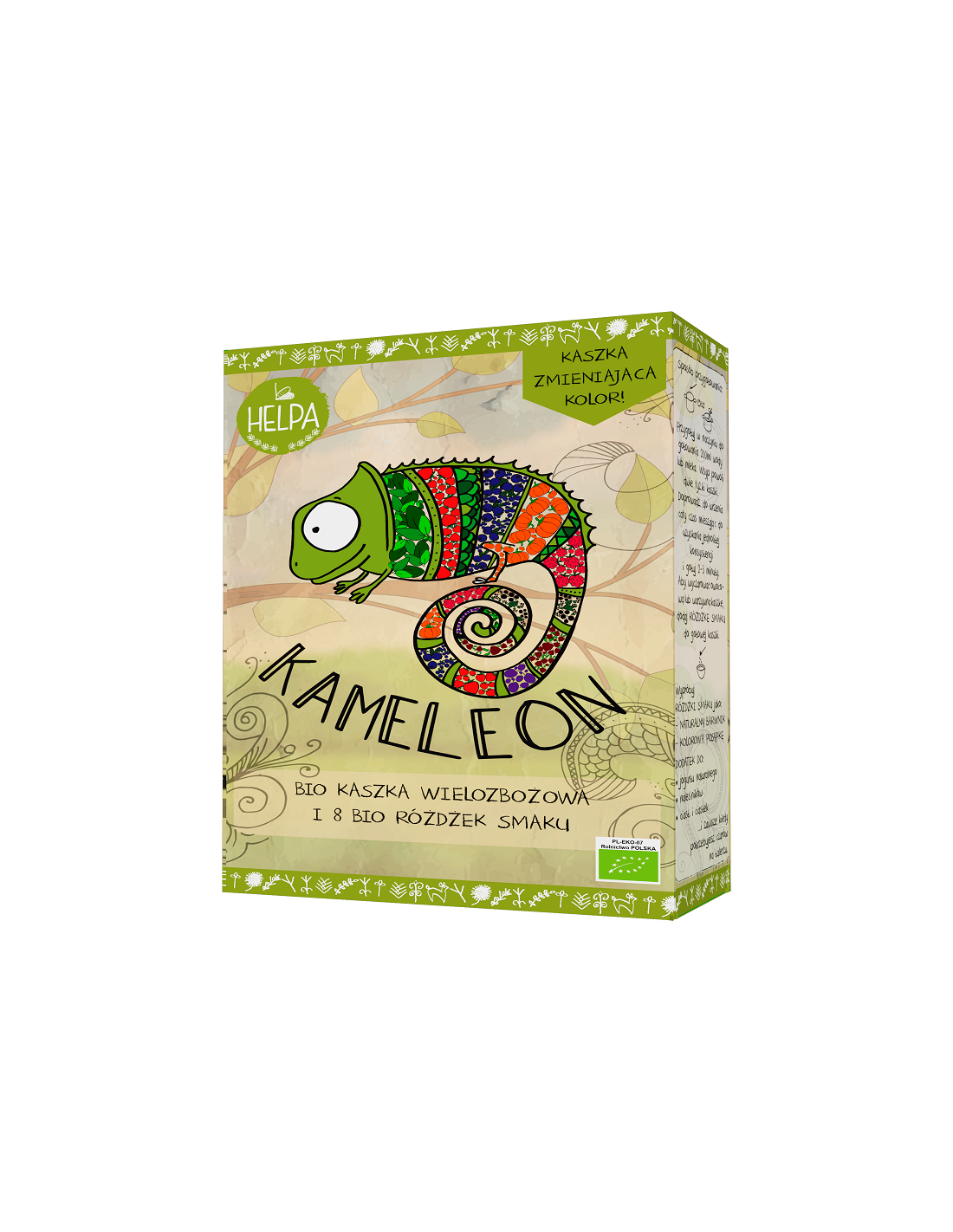 HELPAKameleon to 300 g pysznej kaszki oraz 8 pojedynczych saszetek z liofilizowanymi owocami oraz warzywami. Czaruj w kuchni.