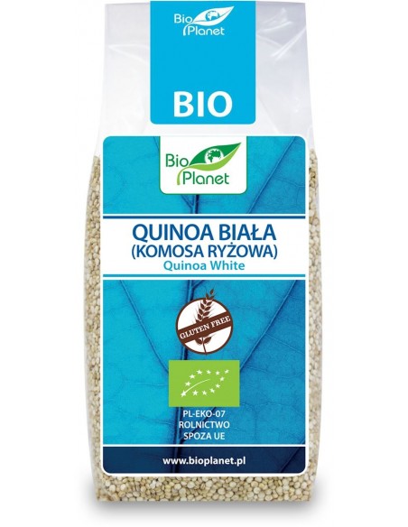 Ekologiczna quinoa biała, znana również jako komosa ryżowa. Z powodzeniem zastępuje tradycyjne kasze lub makarony. Doskonale sprawdza się jako składnik zup oraz dodatek do warzyw, sosów, wypieków, a także deserów.