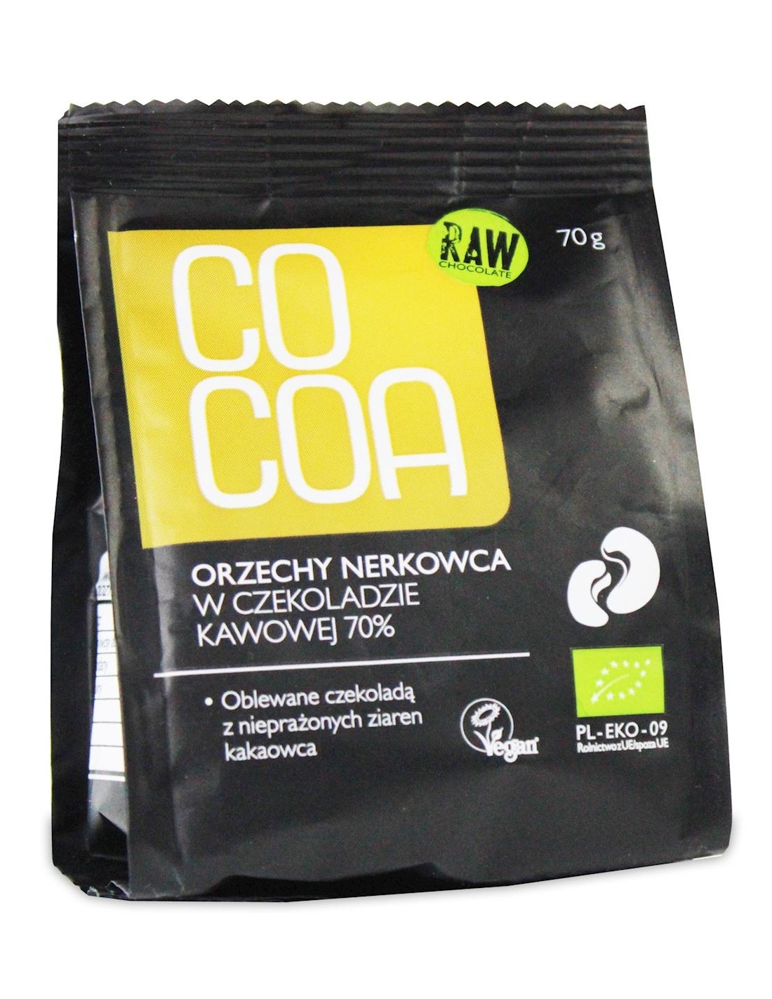 czekolada* 50% (nieprażone ziarno kakaowca*, cukier z kwiatu palmy kokosowej*, tłuszcz kakaowy*, kawa mielona*, wanillia Bourbon*), orzechy nerkowca* 50%. Zawartość masy kakaowej min. 70%.