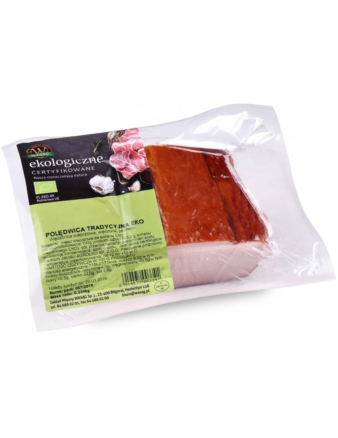mięso wieprzowe ze schabu* (do wyprodukowania 100 g produktu użyto 105,3 g schabu wieprzowego), sól, przeciwutleniacz: askorbinian sodu, substancja konserwująca: azotyn sodu (*certyfikowany składnik ekologiczny)
