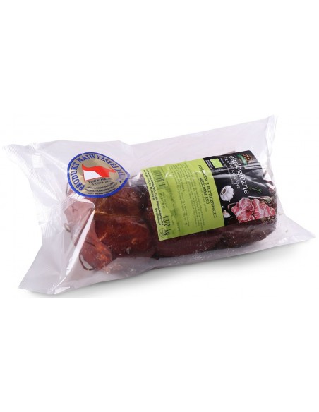 polędwica wieprzowa* (do wyprodukowania 100 g wyrobu gotowego użyto 105,3 g polędwicy wieprzowej), cukier trzcinowy*, przyprawy naturalne*, sól, przeciwutleniacz askorbinian sodu, substancja konserwująca: azotyn sodu (*certyfikowany składnik ekologiczny)